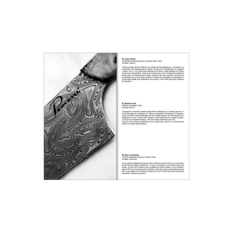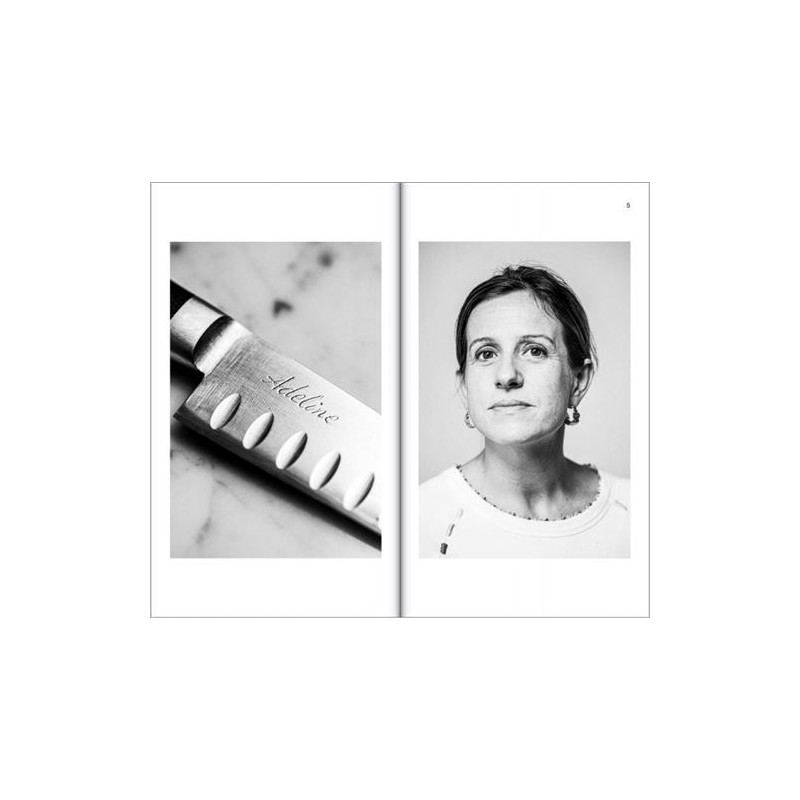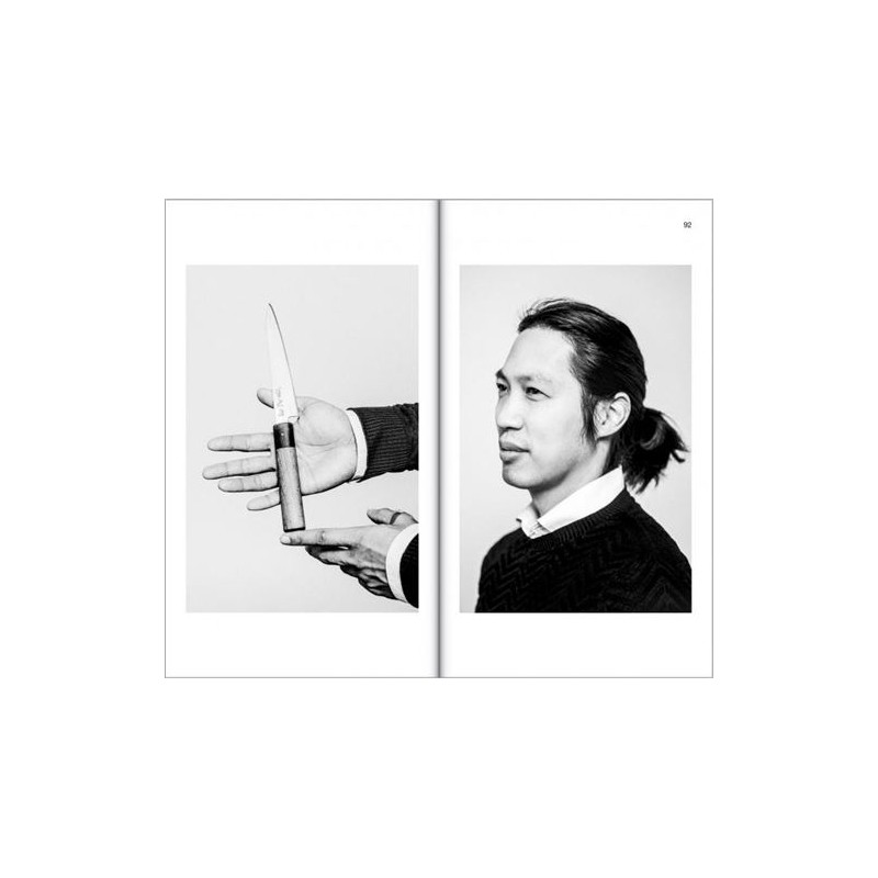 Le protocole récurrent du portrait noir et blanc et de la main tenant le couteau fait de cet ouvrage un magnifique objet graphique, qui traite du geste, de l’outil et de l’artisanat.
