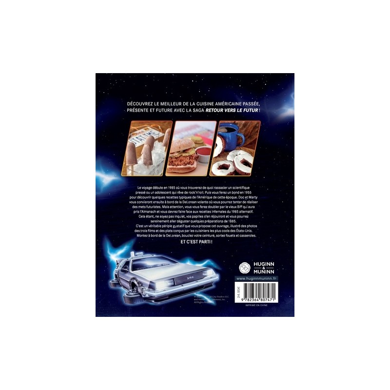 Plus de 65 recettes dans les différentes périodes des trois films : en 1985 avant leurs voyages dans le temps (gâteau au cola de la guerre des groupes, salade de pâtes au pesto au plutonium, feuilletés à toaster quand vous êtes en retard pour l'école...), en 1955 quand Marty découvre ses parents jeunes (le pain de viande de Mme Baines, le blob de l'espace de George McFly, le sundae à la fraise de Marvin Berry...), en 2015 avec les voitures volantes (cookies hoverboards, le cocktail du pitbull de Griff, ramen épicés réhydratés...), en 1985 alternatif quand rien n'est comme avant (calamar frit à la diable de Hell Valley, tiramisu à la Tannen, cordon bleu de Biff...) et en 1885 dans le Far West (punch de cow-boy à la Clint Eastwood, frisbee aux pommes du Far West, ragoût pour admirer les étoiles...).