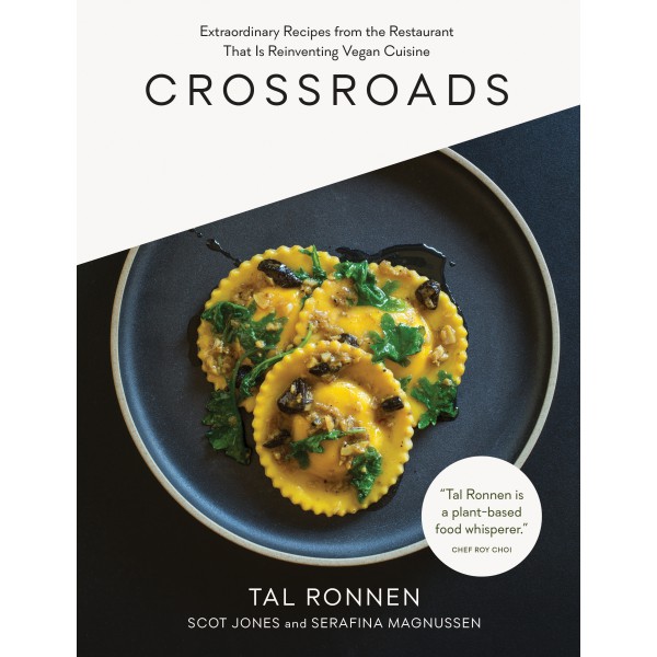 Crossroads est un restaurant vegan installé à Los Angeles depuis 2013, et remportant manifestement un certain succès par la qualité de ses plats. De nombreuses recettes du chef Tal Ronnen vous sont proposées : des snacks et tartinades (chips de pomme de terre à la harissa, houmous de haricots blancs fumés, tapenade de pistaches et olives de kalamata...), des salades (betteraves pommes et noix caramélisées à la réduction de balsamique, salade de carottes marocaines épicée...), des pizzas/tartines (champignons rôtis confiture de tomates au poivre et oignons caramélisés, aubergines aux épinards et menthe...), des soupes (minestrone au pesto crème de fèves et petits pois, soupe de lentilles aux chips de kale...), des entrées (coeurs de palmiers en calamars à la sauce cocktail et aïoli citron-câpres, pois chiches épicés...), des plats de pâtes (fettuccine à l'ail asperges morilles et sauce au prosecco, linguine aux champignons rôtis et sauce tomate basilic...), des desserts (cannoli aux olives kalamata nectarines marinées et grillées à la crème vanille-basilic...), des cocktails, et enfin un chapitre consacré aux basiques (yaourt grec à l'amande, crème de cajou, pesto de basilic, réduction de balsamique...).