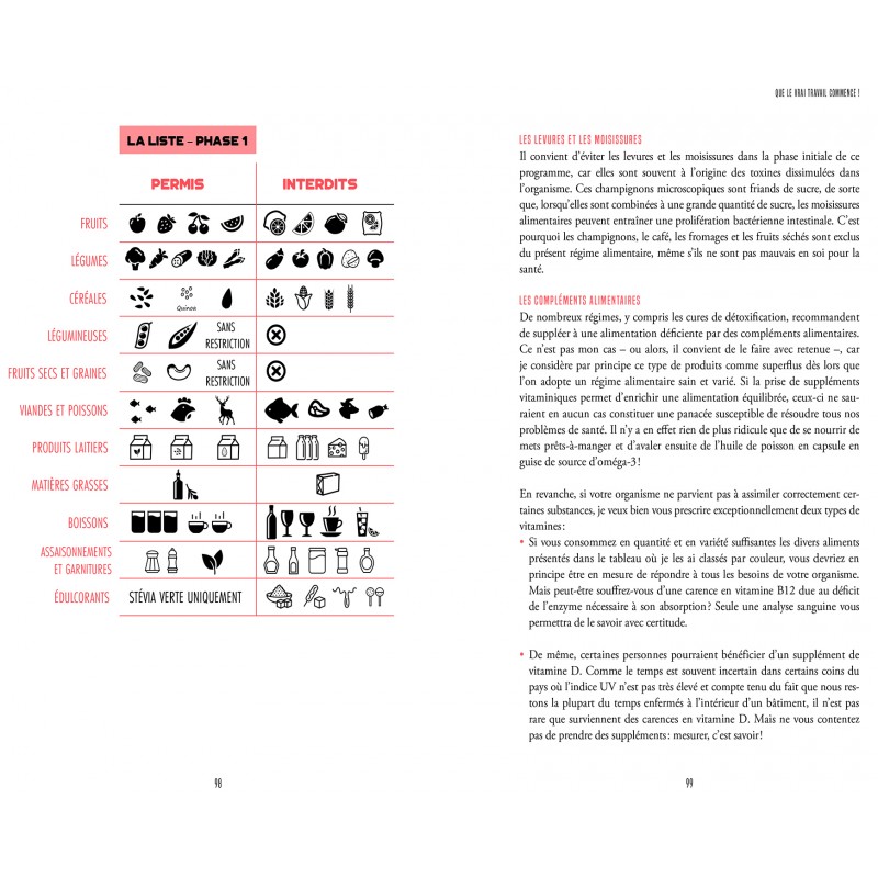 Ecrit par un praticien néerlandais, cette "liste" promet de se nourrir plus sainement, en régénérant complètement le corps en 10 jours. Une introduction, un chapitre pour évaluer son état de santé de départ, une gros phase préparatoire, puis le programme à proprement parler (pas de café, ni de sucre, réorganisation de la cuisine...), des explications pour comprendre ce qui va se passer dans l'estomac, ainsi que sur la phase qui succède à la période d'élimination. Et enfin les recettes, listes de courses et menus pour les 10 jours.